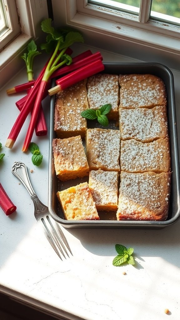 Rhubarb bars are a delightful treat that perfectly balance sweetness and tartness. The image showcases a beautifully baked tray of rhubarb bars, cut into neat squares and dusted with powdered sugar. Fresh rhubarb stalks sit nearby, hinting at the star ingredient. The vibrant red of the rhubarb adds a pop of color, making these bars visually appealing.